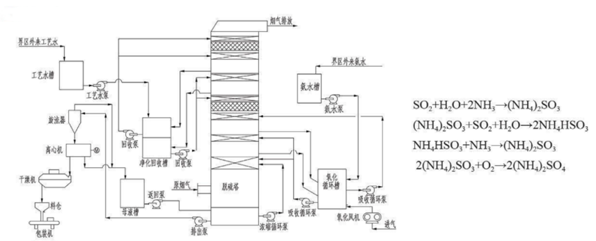 硫銨系統(tǒng):采用飽和結(jié)晶工藝,吸收系統(tǒng)產(chǎn)生一定固含量的硫酸銨漿液,再進行固液分離、干燥和包裝,產(chǎn)出商品硫酸銨;