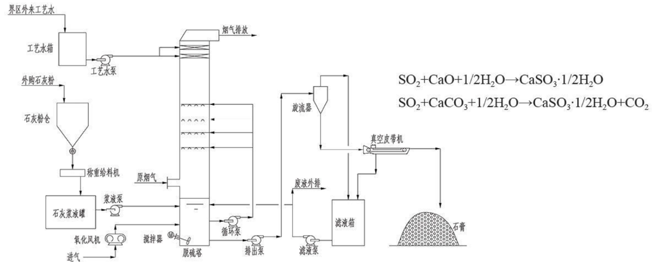 環石灰石/石灰-石膏濕法煙氣脫硫工藝采用廉價易得的石灰石或石灰作為脫硫吸收劑,石灰石經破碎磨細成粉狀與水混合攪拌成漿液。當采用石灰作為吸收劑時,石灰粉經消化處理后加水攪拌制成吸收漿液。在吸收塔內,吸收漿液與煙氣接觸混合,煙氣中的二氧化硫與漿液中的碳酸鈣以及鼓入的氧化空氣進行化學反應,最終反應產物為石膏。同時去除煙氣中部分其他污染物,如粉塵、HCl、HF、SO3。脫硫后的煙氣經除霧器除去帶出的細小液滴,經熱交換器加熱升溫后排入煙囪。脫硫石膏漿液經脫水裝置脫水后回收。該技術采用單循環噴霧空塔結構,具有技術成熟、應用范圍廣、脫硫效率高、運行可靠性高、可利用率高、工程造價低的特點。