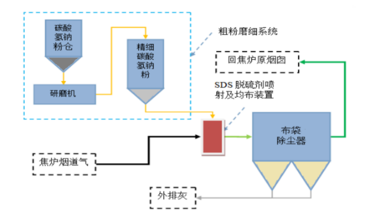 利用碳酸氫鈉(粒徑為20-25μm)做為脫硫劑,通過噴射系統(tǒng)將NaHCO3均勻噴入煙氣管道中與270-290℃煙道氣進行混合反應(yīng),鈉基粉體在高溫廢氣中激活熱分解,與廢氣中的SO2充分接觸,發(fā)生物理、化學(xué)反應(yīng),煙氣中的SO2等酸性物質(zhì)被吸收凈化,在反應(yīng)器、煙道及布袋除塵器內(nèi),脫硫劑超細粉一直與煙氣中的SO2發(fā)生反應(yīng)。可生產(chǎn)副產(chǎn)物Na2SO4。通過布袋除塵器回收脫硫副產(chǎn)物。