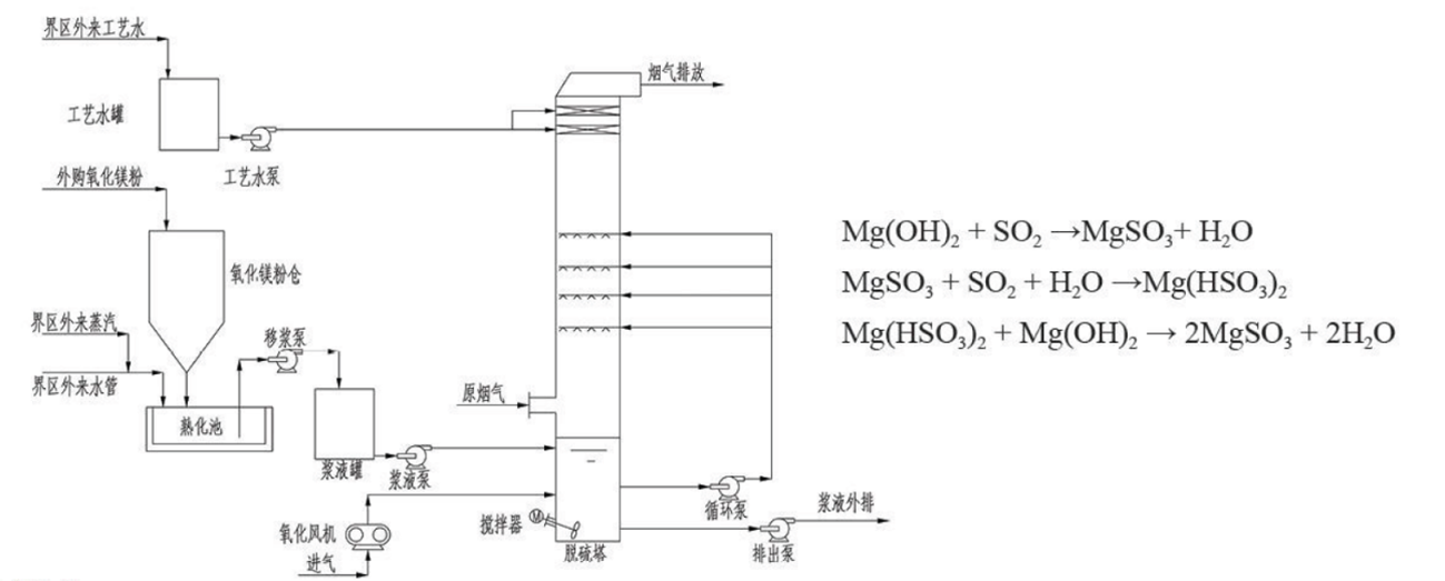 氧化鎂脫硫是一種成熟度僅次于鈣法的脫硫工藝,即利用氧化鎂粉和工藝水桉照一定比例混合在—起,熟化制成一定濃度的氫氧化鎂漿液,送入吸收塔中,漿液自上而下和煙氣中的二氧化硫進(jìn)行逆向接觸反應(yīng),生成亞硫酸鎂和硫酸鎂。